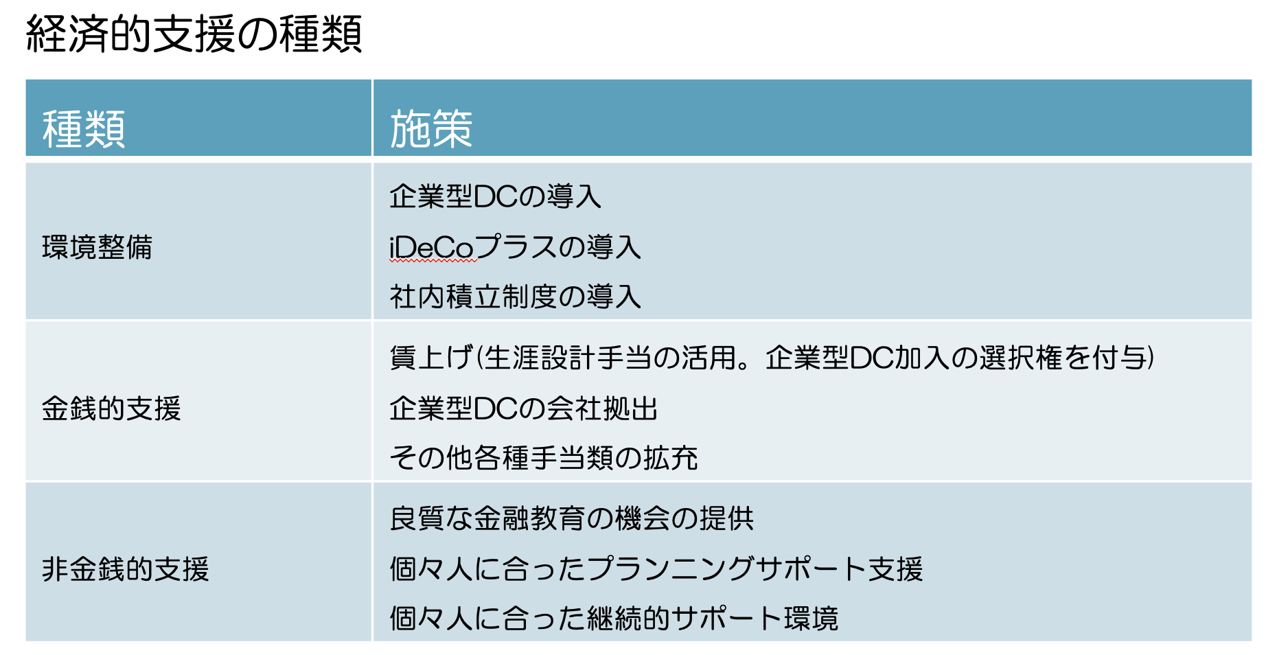 国が用意した効果的な退職金準備制度である「企業型確定拠出年金(企業型DC)」や、iDeCoプラスなどの導入など、従業員の方が効果的に将来資産づくりに取り組める環境を整備することです。