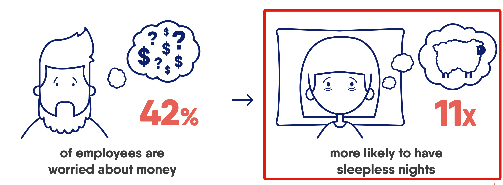 42%の従業員はお金に対する悩みを抱えていて、その人達はsleepless=眠れない夜を過ごすことが11倍も高いのです。