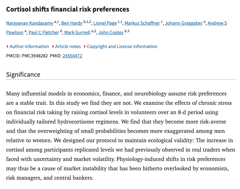 ケンブリッジ大学の研究者達の研究によれば、慢性的にコルチゾール(ストレスホルモン)が高い状態では、意思決定者はよりリスク回避的になることがわかりました。