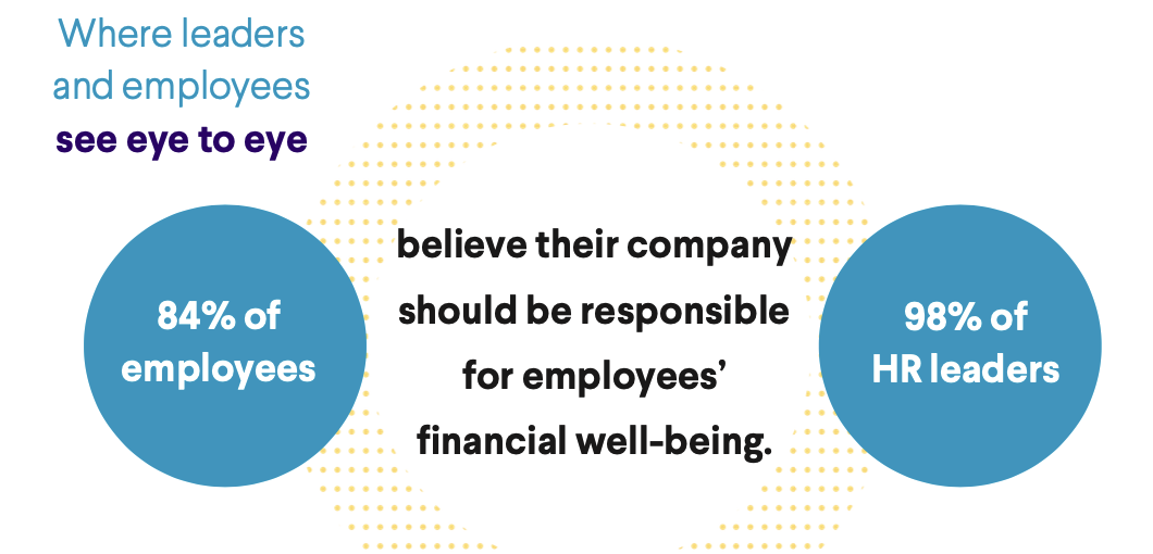 また、従業員のファイナンシャルウェルビーイング実現のための責任を企業が持つと答える比率は従業員が84%に対して、人事系リーダーは98%に上ります。
