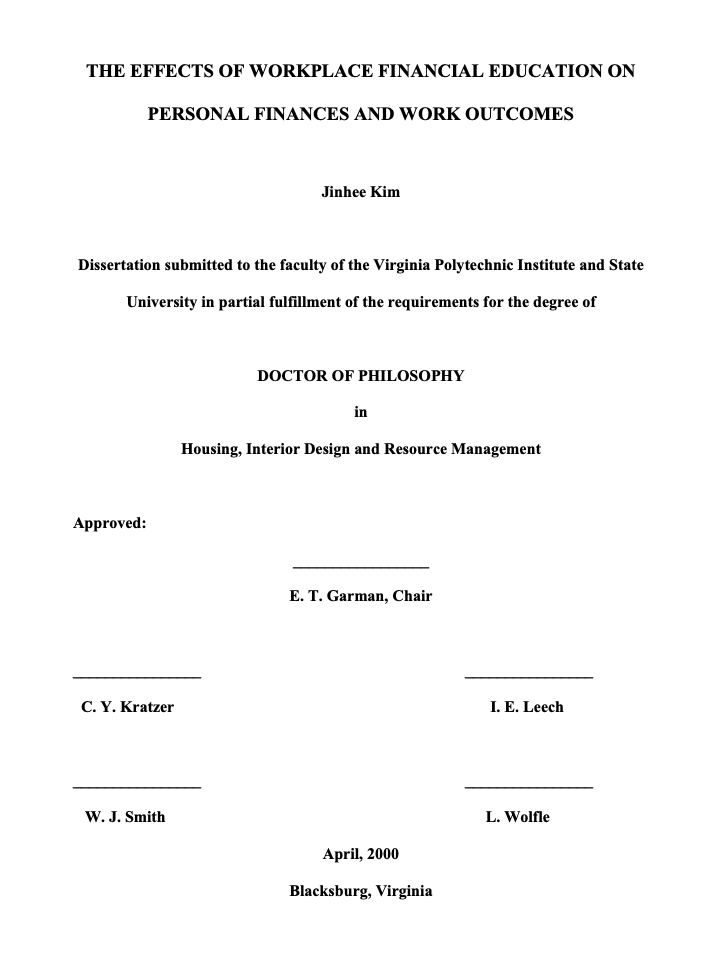 バージニア工科大学のJinhee Kim (2000) の研究は、職場での金融教育が従業員の家計改善と労働成果向上の双方に寄与することを実証的に示した先駆的研究です。