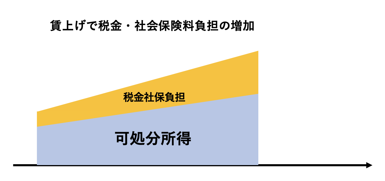 まず、何も対策をしないとせっかく企業が賃上げしても、従業員の税金・社会保険料も上昇し、可処分所得は伸び悩みます。